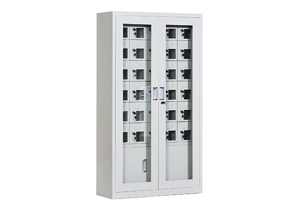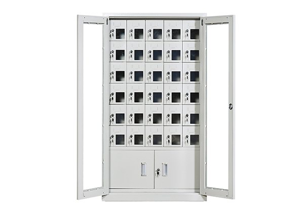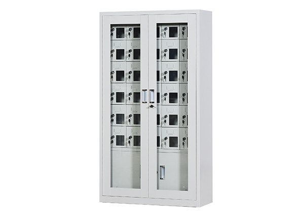 手機保密柜正面為對開金屬邊框玻璃大門,便于觀察柜內情況,堅固透亮,美觀大方。